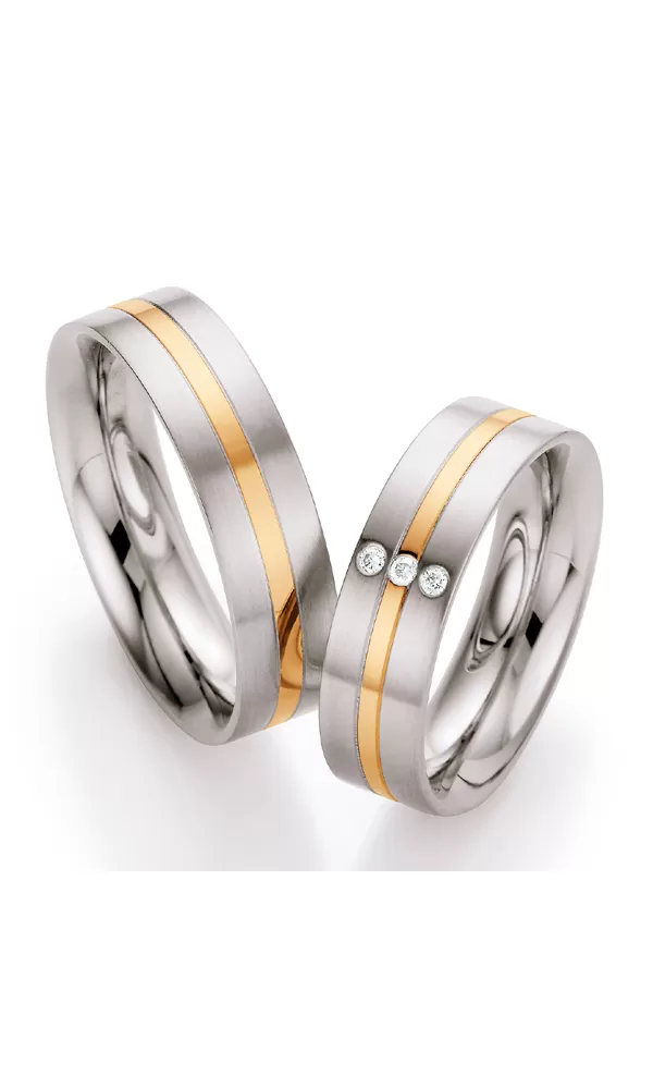 Snubní prsteny z chirurgické oceli v kombinaci s růžovým zlatem 585/1000 = 14 karátů v půlkulatém profilu s kombinovanou povrchovou úpravou - ocelová část sametově matná, růžové zlato lesklé. V dámském prstenu jsou vsazeny tři kulaté diamanty briliantového brusu. Snubní prsteny mají vnitřní fit profil - zaoblení vnitřní strany prstenů.  Diamanty vynikají svou krásou a vlastnostmi, které jsou oproti jiným kamenům bezkonkurenční. Je to nejtvrdší nerost, který nikdy neztratí svou hodnotu. Diamant je král všech drahokamů a tedy i jedním z nejcennějších a proto se vyplatí do šperků s diamanty investovat a především u snubních prstenů, které jsou na celý život! Vsazování diamantů provádějí naši nejzkušenější mistři zlatníci ručně pod mikroskopem s přesností na 0,01mm a proto nehrozí vypadnutí kamínků jako to bývá u strojně vyráběných snubních prstenů. Snubní prsteny mají vnitřní fit profil - zaoblení vnitřní strany prstenů pro příjemnější nošení, nasazování a sundavání prstenů.