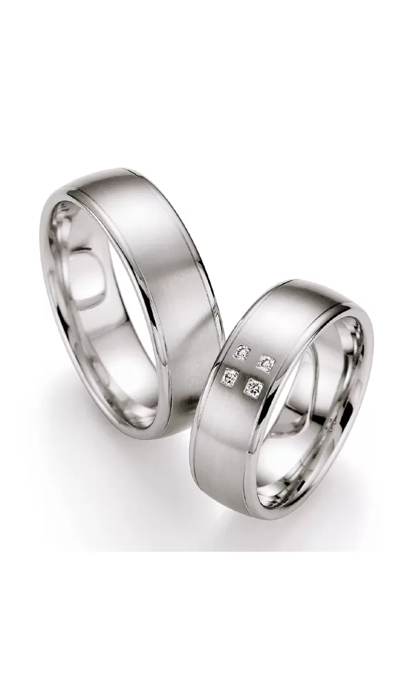 Snubní prsteny bílé zlato vyrobeny z čtrnáctikarátového bílého zlata - 585/000 v mírně půlkulatém profilu v matné povrchové úpravě s lesklými proužky na krajích zvýrazněny jemnými rýhami. V dámském prstenu jsou vsazeny čtyři kulaté diamanty briliantového brusu. Diamanty oplývají svou krásou a vlastnostmi, které jsou oproti jiným kamenům bezkonkurenční. Je to nejtvrdší nerost, který nikdy neztratí svou hodnotu. Diamant je král všech drahokamů a tedy i jedním z nejcennějších a proto se vyplatí do šperků s diamanty investovat a především u snubních prstenů, které jsou na celý život! Vsazování diamantů provádějí naši nejzkušenější mistři zlatníci ručně pod mikroskopem s přesností na 0,01mm a proto nehrozí vypadnutí kamínků jako to bývá u strojně vyráběných snubních prstenů. Snubní prsteny mají vnitřní fit profil - zaoblení vnitřní strany prstenů pro příjemnější nošení.