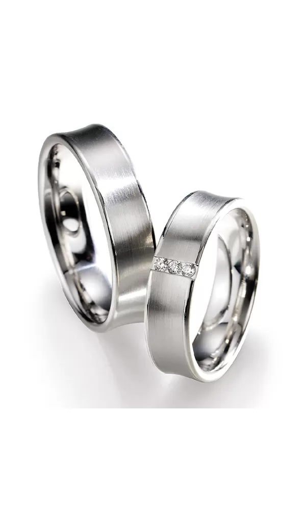 Snubní prsteny ze zlata vyrobeny z čtrnáctikarátového bílého zlata - 585/000 v moderním konkávním profilu v matné povrchové úpravě s lesklými kraji. V dámském prstenu jsou vsazeny tři kulaté diamanty briliantového brusu. Diamanty oplývají svou krásou a vlastnostmi, které jsou oproti jiným kamenům bezkonkurenční. Je to nejtvrdší nerost, který nikdy neztratí svou hodnotu. Diamant je král všech drahokamů a tedy i jedním z nejcennějších a proto se vyplatí do šperků s diamanty investovat a především u snubních prstenů, které jsou na celý život! Vsazování diamantů provádějí naši nejzkušenější mistři zlatníci ručně pod mikroskopem s přesností na 0,01mm a proto nehrozí vypadnutí kamínků jako to bývá u strojně vyráběných snubních prstenů. Snubní prsteny mají vnitřní fit profil - zaoblení vnitřní strany prstenů pro příjemnější nošení.