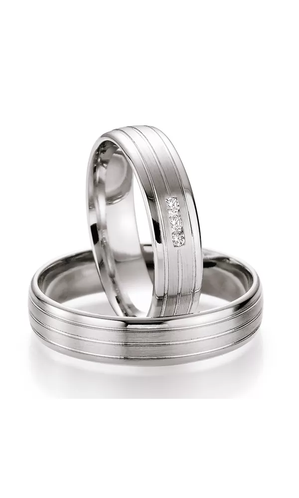 Snubní prsteny bílé zlato vyrobeny z čtrnáctikarátového bílého zlata - 585/000 v mírně půlkulatém profilu v kombinované povrchové úpravě - střed prstenů sametově matný, proužky na krajích lesklé se třemi lesklými rýhami. V dámském prstenu jsou vsazeny tři kulaté diamanty briliantového brusu. Diamanty oplývají svou krásou a vlastnostmi, které jsou oproti jiným kamenům bezkonkurenční. Je to nejtvrdší nerost, který nikdy neztratí svou hodnotu. Diamant je král všech drahokamů a tedy i jedním z nejcennějších a proto se vyplatí do šperků s diamanty investovat a především u snubních prstenů, které jsou na celý život! Vsazování diamantů provádějí naši nejzkušenější mistři zlatníci ručně pod mikroskopem s přesností na 0,01mm a proto nehrozí vypadnutí kamínků jako to bývá u strojně vyráběných snubních prstenů. Snubní prsteny mají vnitřní fit profil - zaoblení vnitřní strany prstenů pro příjemnější nošení.