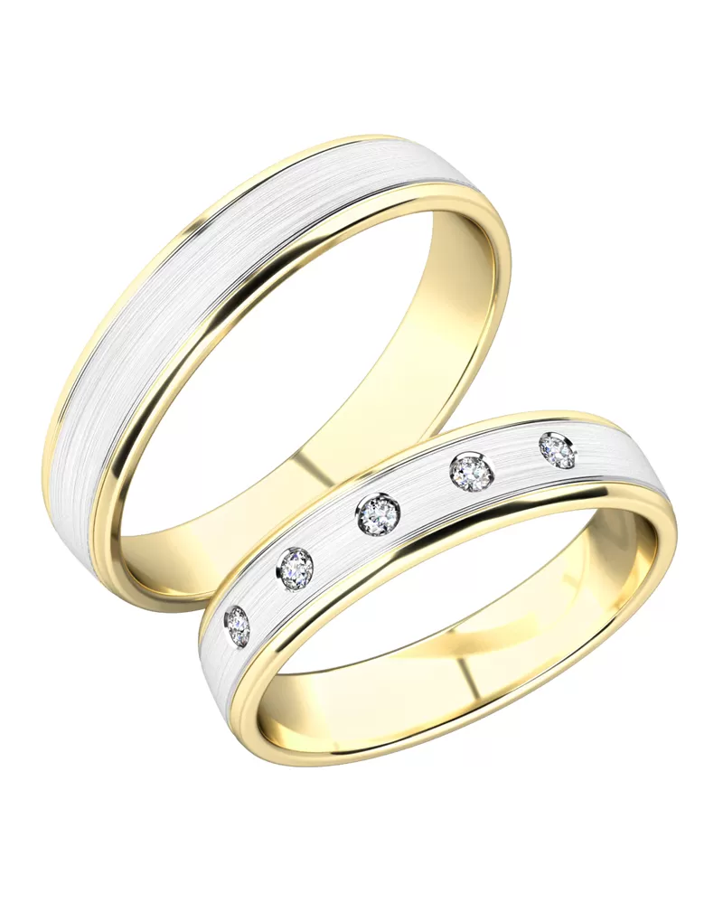 Snubní prsteny jsou vyrobeny z bílého a žlutého čtrnáctikarátového zlata 585/1000 mírně půlkulatého profilu s vnitřním fit profilem - zaoblení vnitřní strany pro příjemnější nošení s kombinovanou povrchovou úpravou lesk - sametový mat, který je oddělen jemnými rýhami. V dámském prstenu je vsazeno pět kulatých zirkonů s briliantovým brusem Signity star, který dodává zirkonům oslnivou brilanci. Do snubních prstenů si můžete nechat vsadit také diamanty. Kameny jsou do prstenu vsazeny "na hladko". Vsazování zirkonů i diamantů provádějí naši nejzkušenější mistři zlatníci ručně pod mikroskopem s přesností na 0,01mm a proto nehrozí vypadnutí kamínků jako to bývá u strojně vyráběných snubních prstenů. Snubní prsteny je možné vyrobit v různých barevných kombinacích zlata a s libovolným počtem kamenů. Dále je možné snubní prsteny udělat užší - nižší cena nebo širší - vyšší cena.
