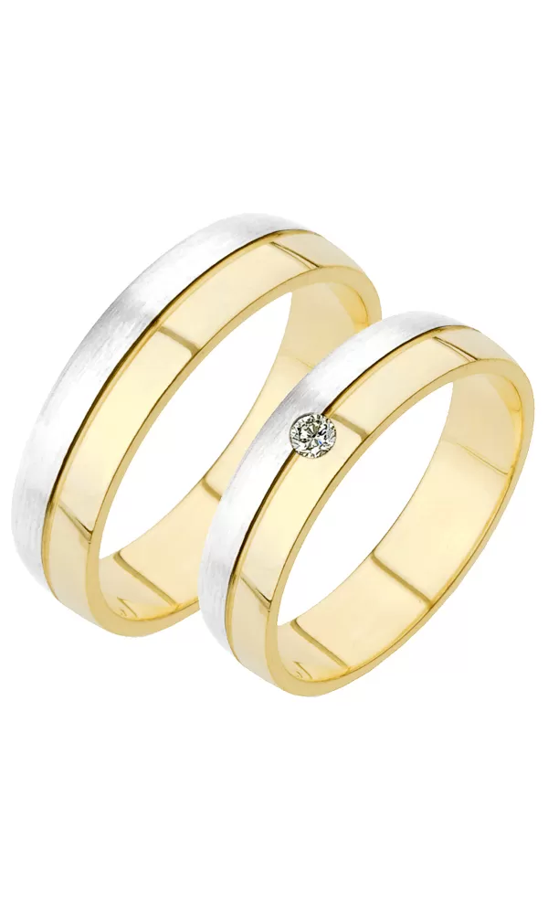 Zlaté snubní prsteny vyrobeny ze žlutého a bílého čtrnáctikarátového zlata 585/1000 mírně půlkulatého profilu s kombinovanou povrchovou úpravou lesk - sametový mat. V dámském prstenu je vsazen jeden kulatý zirkon popř. diamant briliantového brusu. Snubní prsteny je možné vyrobit v různých šířkách např. 4,00mm a v různých barevných kombinací zlata a povrchových úpravách.
