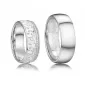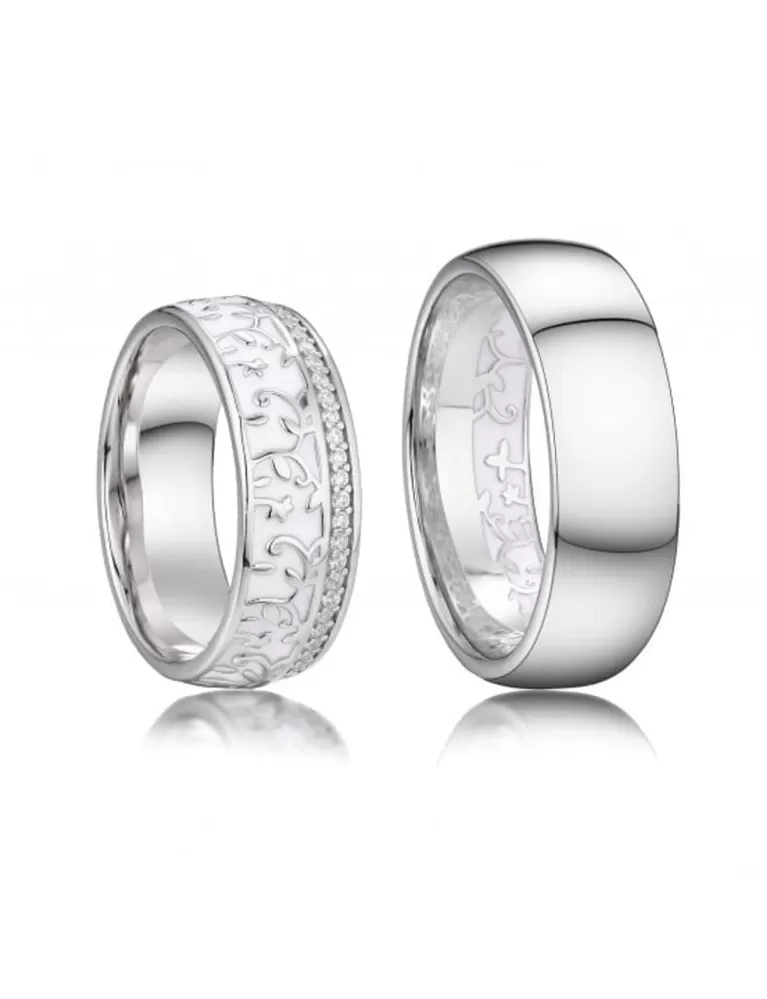 Moderní stříbrné snubní prsteny v půlkulatém profilu vyrobené ze stříbra 925/1000. Povrch dámského prstenu je potažen bílým smaltem a zdoben jemným stříbrným motivem a v prstenu je vsazeno po obvodu 52 kulatých zirkonů s briliantovým brusem Signity star, který dodává zirkonům maximální brilanci. Pánský prsten má povrch ve vysokém lesku a bílý smalt a stříbrný motiv je použit na vnitřní straně prstenu. Prsteny mají vnitřní fit profil - zaoblenou vnitřní stranu pro příjemnější nošení, nasazování a sundavání.