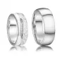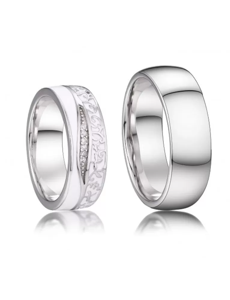 Moderní stříbrné snubní prsteny v mírně půlkulatém profilu vyrobené ze stříbra 925/1000. Povrch dámského prstenu je potažen bílým smaltem a zdoben jemným stříbrným motivem a v prstenu je vsazeno po obvodu 6 kulatých zirkonů s briliantovým brusem Signity star, který dodává zirkonům maximální brilanci. Pánský prsten má povrch ve vysokém lesku. Prsteny mají vnitřní fit profil - zaoblenou vnitřní stranu pro příjemnější nošení, nasazování a sundavání.