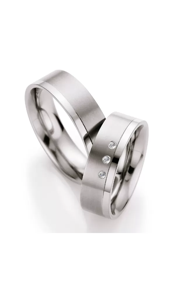 Snubní prsteny z titanu rovného profilu s kombinovanou povrchovou úpravou lesk - sametový mat, který rozděluje jemná rýhá a se třemi kulatými diamanty briliantového brusu v dámském prstenu. Diamanty vynikají svou krásou a vlastnostmi, které jsou oproti jiným kamenům bezkonkurenční. Je to nejtvrdší nerost, který nikdy neztratí svou hodnotu. Diamant je král všech drahokamů a tedy i jedním z nejcennějších a proto se vyplatí do šperků s diamanty investovat a především u snubních prstenů, které jsou na celý život! Vsazování diamantů provádějí naši nejzkušenější mistři zlatníci ručně pod mikroskopem s přesností na 0,01mm a proto nehrozí vypadnutí kamínků jako to bývá u strojně vyráběných snubních prstenů. Snubní prsteny mají vnitřní fit profil - zaoblení vnitřní strany prstenů pro příjemnější nošení, nasazování a sundavání prstenů.