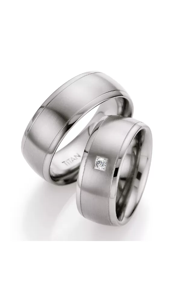 Široké titanové snubní prsteny půlkulatého profilu s matnou povrchovou úpravou a lesklými proužky po stranách zvýrazněnými jemnými rýhami. V dámském prstenu je vsazen jeden kulatý diamant briliantového brusu do čtverečku. Diamanty vynikají svou krásou a vlastnostmi, které jsou oproti jiným kamenům bezkonkurenční. Je to nejtvrdší nerost, který nikdy neztratí svou hodnotu. Diamant je král všech drahokamů a tedy i jedním z nejcennějších a proto se vyplatí do šperků s diamanty investovat a především u snubních prstenů, které jsou na celý život! Vsazování diamantů provádějí naši nejzkušenější mistři zlatníci ručně pod mikroskopem s přesností na 0,01mm a proto nehrozí vypadnutí kamínků jako to bývá u strojně vyráběných snubních prstenů. Snubní prsteny mají vnitřní fit profil - zaoblení vnitřní strany prstenů pro příjemnější nošení, nasazování a sundavání prstenů.
