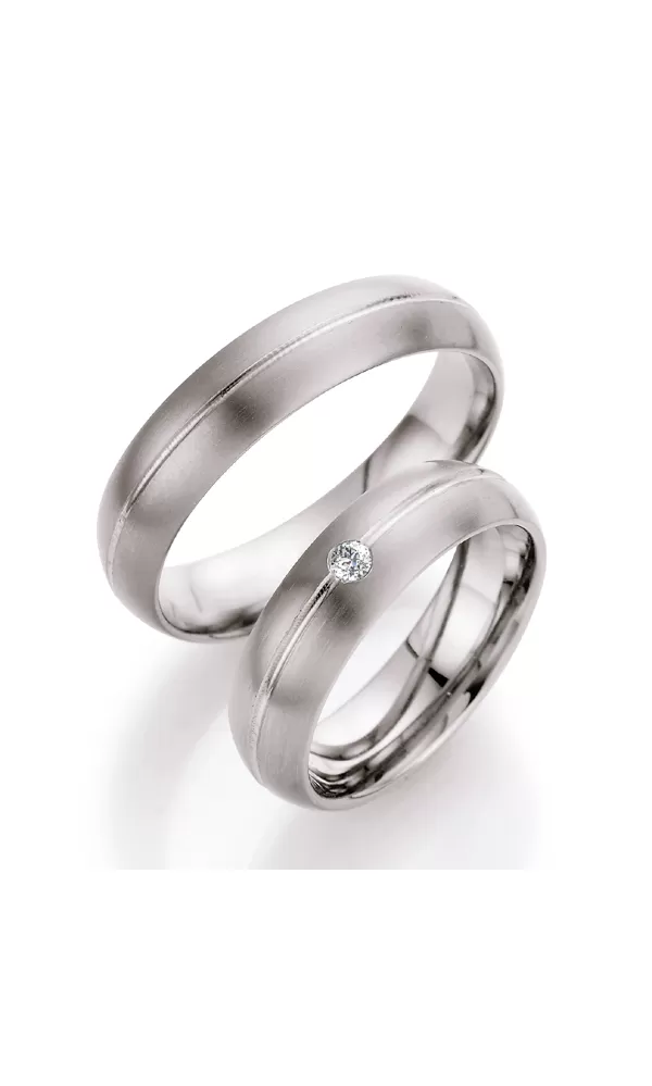 Titanové snubní prsteny půlkulatého profilu se sametovou matnou povrchovou úpravou a lesklou rýhou uprostřed, kde je vsazen jeden kulatý diamant… Celý popis