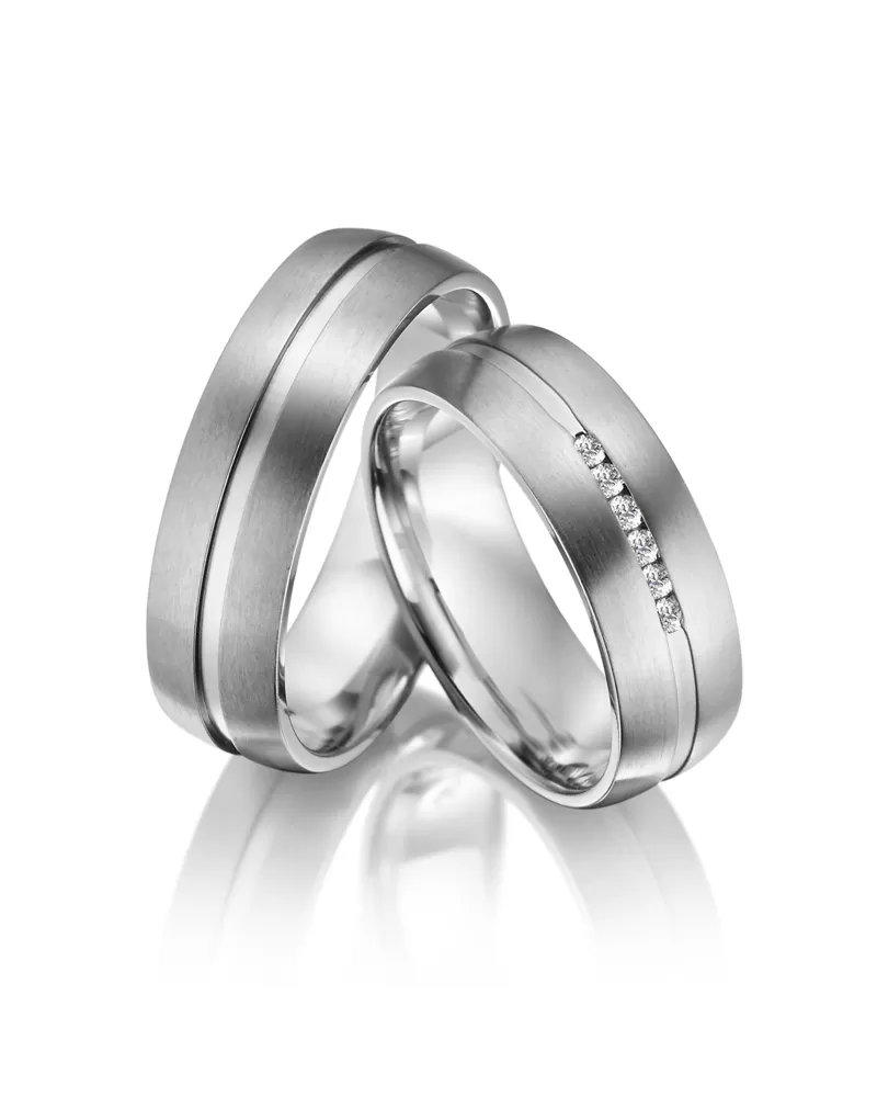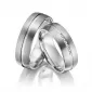 Luxusní snubní prsteny z titanu mírně půlkulatého profilu v matovanému povrchu. Prsteny zdobí pískovaná rýha, které dělí prsten na tři části. Dámský prsten je osazen šesti kulatými zirkony s briliantovým brusem Signity star, který dodává zirkonům maximální brilanci, které zdobí rýhu. Prsteny mají vnitřní fit profil - zaoblenou vnitřní stranu pro příjemnější nošení, nasazování a sundavání.