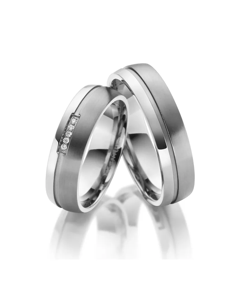 Titanové snubní prsteny mírně půlkulatého profilu s kombinovanou povrchovou úpravou vysoký lesk a mat. Prsteny mají uzší část ve vysokém v lesku a druhou větší část v sametovém matu. Tyto části jsou od sebe oddělené výraznou pískovanou rýhou. Dámský prsten má rýhu lemovanou pěti zářivými zirkony s briliantovým brusem Signity star, který dodává zirkonům maximální brilanci. Prsteny mají vnitřní fit profil - zaoblenou vnitřní stranu pro příjemnější nošení, nasazování a sundavání.
