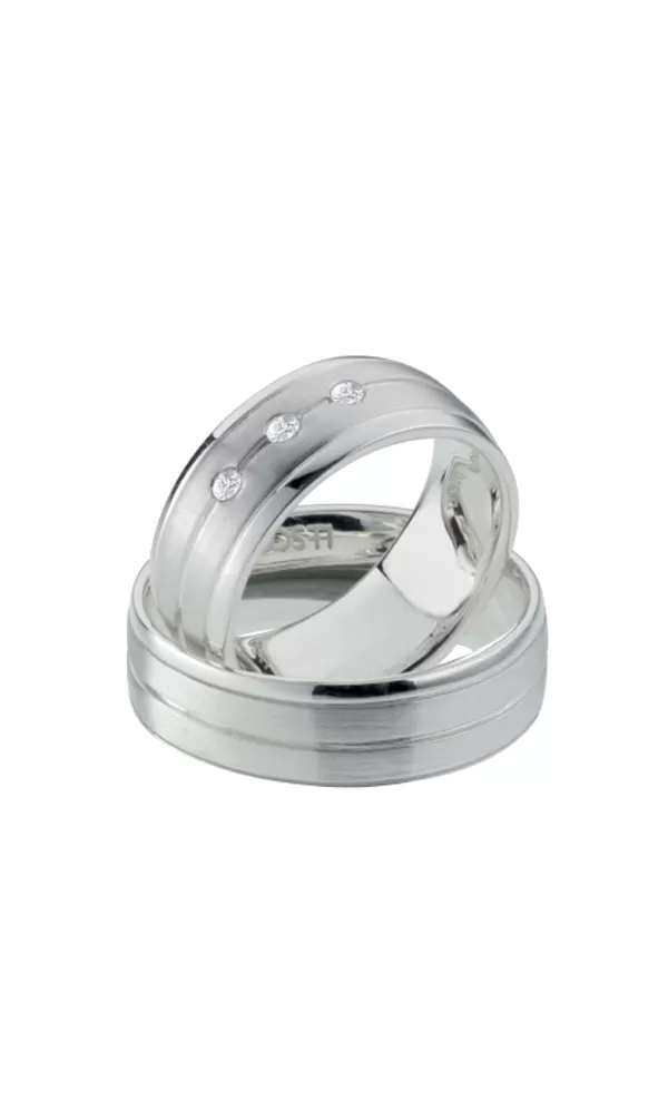Snubní prsteny z titanu v mírně půlkulatém profilu s kombinovanou povrchovou úpravou lesk - sametový mat, kdy jsou lesklé proužky odděleny jemnými rýhami. V dámském prstenu jsou vsazeny tři kulaté zirkony s briliantovým brusem Signity star, který dodává zirkonům maximální brilanci. Prsteny mají vnitřní fit profil - zaoblenou vnitřní stranu pro příjemnější nošení, nasazování a sundavání.
