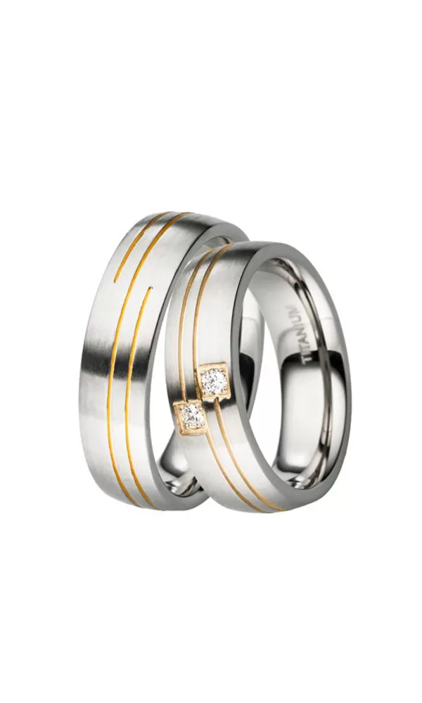 Snubní prsteny z titanu v mírně půlkulatém profilu s matnou povrchovou úpravou a matnými zlacenými rýhami po obvodu technologií PVD. V dámském prstenu jsou do čtverečku vsazeny dva kulaté zirkony s briliantovým brusem Signity star, který dodává zirkonům maximální brilanci. Prsteny mají vnitřní fit profil - zaoblenou vnitřní stranu pro příjemnější nošení, nasazování a sundavání.