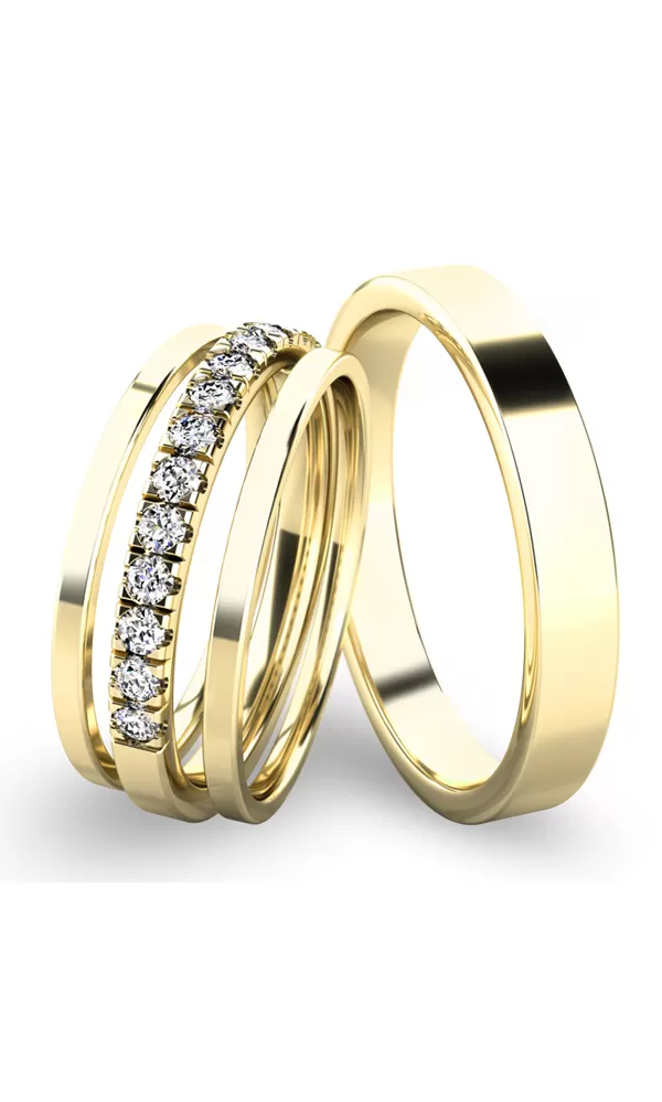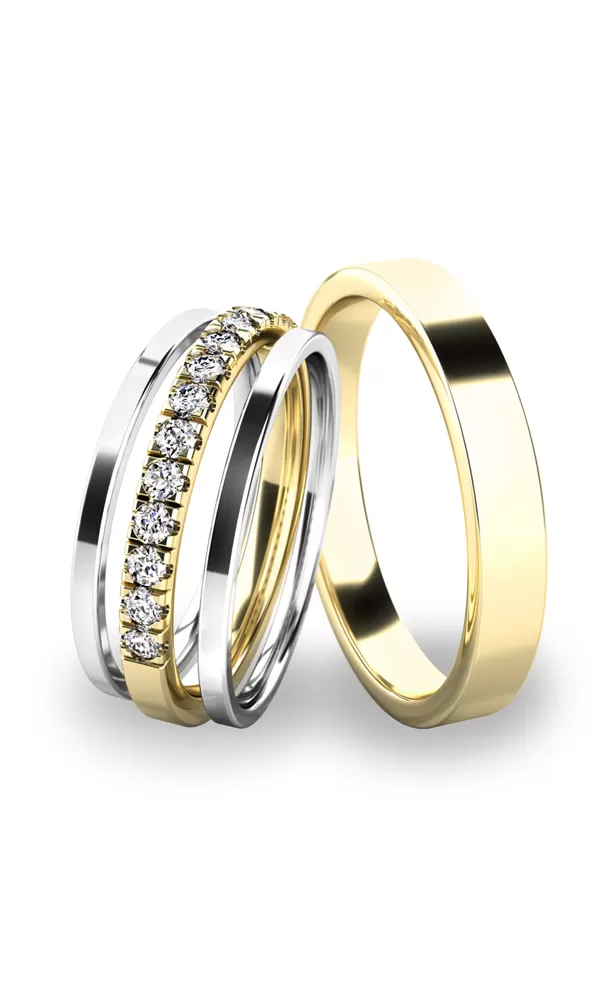 • Bílé - žluté zlato: Dámský prsten se zirkony a pánský prsten je ze žlutého zlata a postranní kroužky jsou z bílého zlata