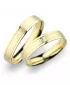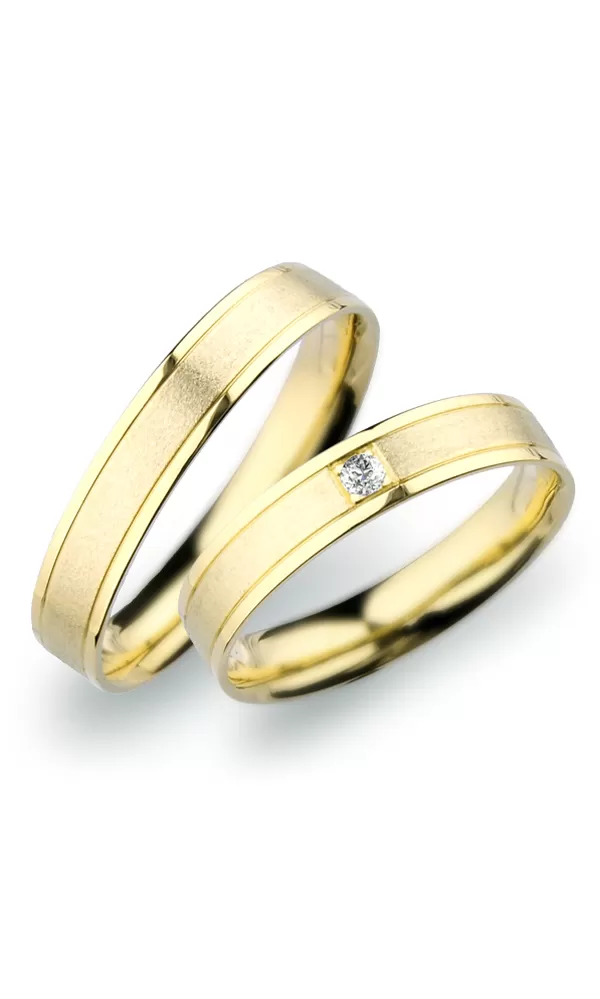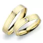 Snubní prsteny rovného profilu vyrobeny ze žlutého čtrnáctikarátového zlata 585/1000 s kombinovanou povrchovou úpravou lesk - diamantový mat, který je oddělen jemnými lesklými rýhami. Snubní prsteny mají vnitřní Fit Profil - půlkulatou vnitřní stranu pro příjemnější nošení. V dámském prstenu je vsazen jeden kulatý zirkon popř. diamant briliantového brusu. Snubní prsteny je možné vyrobit v různých barevných kombinacích zlata a s libovolným počtem kamenů např. se třemi. Dále je možné snubní prsteny udělat užší - nižší cena nebo širší - vyšší cena.