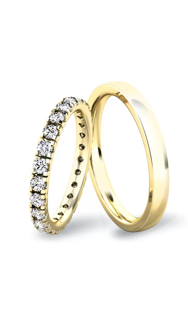 Snubní prsteny mírně půlkulatého profilu jsou vyrobeny ze žlutého čtrnáctikarátového zlata 585/1000 v lesklé povrchové úpravě. V dámském prstenu je vsazeno dle velikosti prstenu 24ks kulatých zirkonů s briliantovým brusem Signity star, který dodává zirkonům oslnivou brilanci. Do snubních prstenů si můžete nechat vsadit také diamanty. Kameny jsou vsazeny do krapniček. Vsazování zirkonů i diamantů provádějí naši nejzkušenější mistři zlatníci ručně pod mikroskopem a proto nehrozí vypadnutí kamínků jako to bývá u strojně vyráběných snubních prstenů.