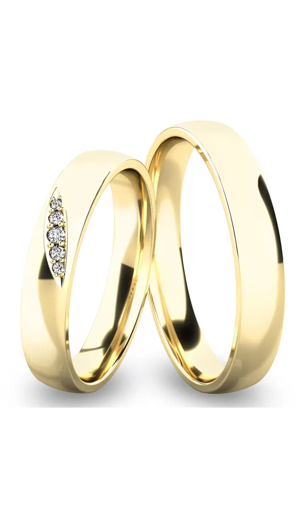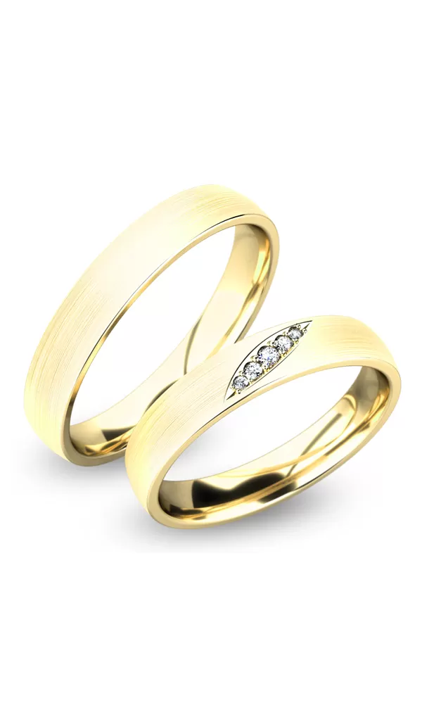 Snubní prsteny v mírně půlkulatém profilu jsou vyrobeny ze žlutého čtrnáctikarátového zlata 585/1000 v lesklé povrchové úpravě v nadčasovém designu. Snubní prsteny mají vnitřní Fit Profil - půlkulatou vnitřní stranu pro příjemnější nošení, nasazování a sundavání. V dámském prstenu je vsazeno pět kulatých zirkonů s briliantovým brusem Signity star, který dodává zirkonům oslnivou brilanci. Do snubních prstenů si můžete nechat vsadit také diamanty. Kameny jsou vsazeny do zrnek. Vsazování zirkonů i diamantů provádějí naši nejzkušenější mistři zlatníci ručně pod mikroskopem a proto nehrozí vypadnutí kamínků jako to bývá u strojně vyráběných snubních prstenů.