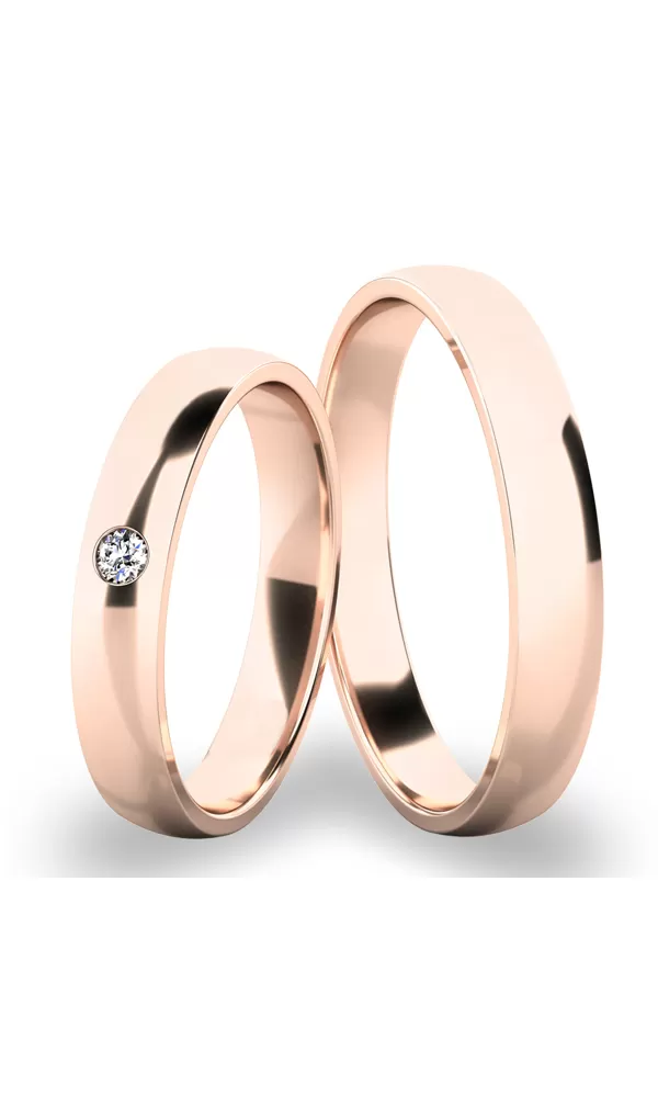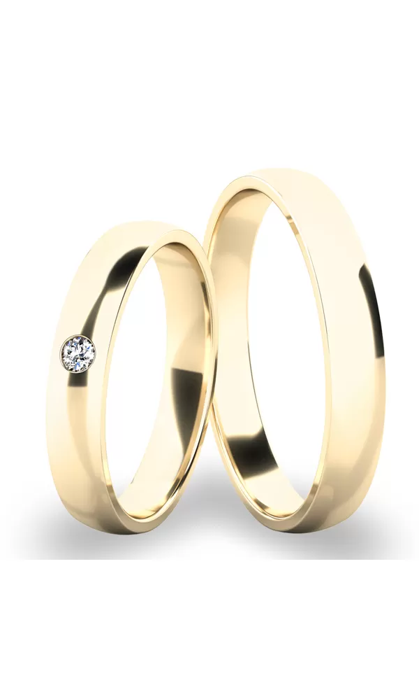 Snubní prsteny půlkulatého profilu jsou vyrobeny ze žlutého čtrnáctikarátového zlata 585/1000 v lesklé povrchové úpravě. Snubní prsteny mají vnitřní Fit Profil - půlkulatou vnitřní stranu pro příjemnější nošení, nasazování a sundavání. V dámském prstenu je vsazen jeden kulatý zirkon s briliantovým brusem Signity star, který dává zirkonům oslnivou brilanci. Do snubních prstenů si můžete nechat vsadit i diamant. Kámen je vsazen "na hladko". Vsazování zirkonů i diamantů provádějí naši nejzkušenější mistři zlatníci ručně pod mikroskopem a proto nehrozí vypadnutí kamínků jako to bývá u strojně vyráběných snubních prstenů.