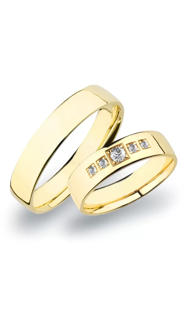 Snubní prsteny v mírně půlkulatém profilu vyrobeny ze žlutého čtrnáctikarátového zlata 585/1000 v lesklé povrchové úpravě. Snubní prsteny mají vnitřní Fit Profil - půlkulatou vnitřní stranu pro příjemnější nošení, nasazování a sundavání. V dámském prstenu je vsazeno pět kulatých zirkonů popř. diamantů briliantového brusu.