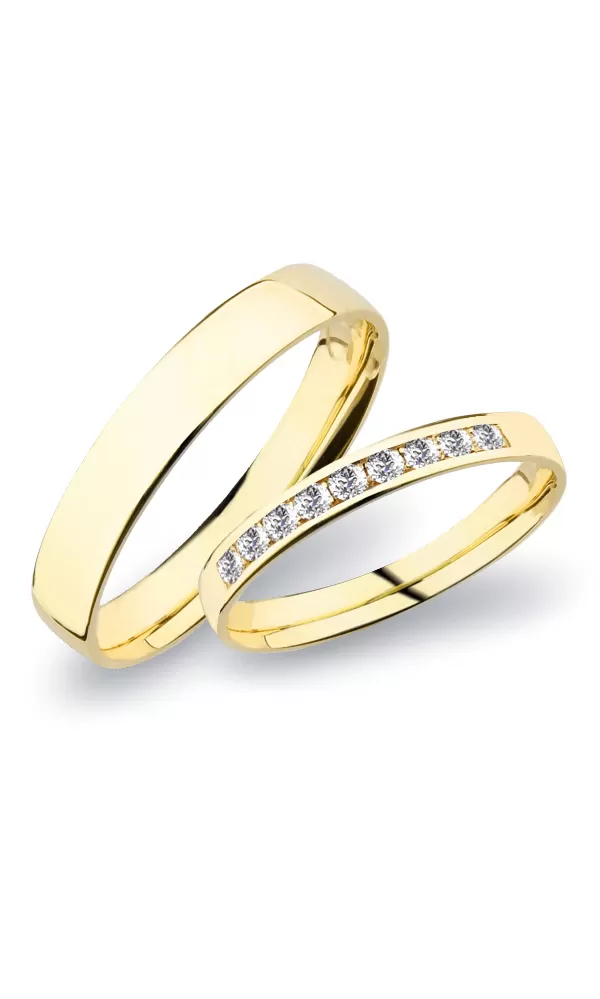 Užší snubní prsteny mírně půlkulatého profilu vyrobeny ze žlutého čtrnáctikarátového zlata 585/1000 v lesklé povrchové úpravě. Snubní prsteny mají vnitřní Fit Profil - půlkulatou vnitřní stranu pro příjemnější nošení, nasazování a sundavání. V dámském prstenu je vsazeno devět kulatých zirkonů popř. diamantů briliantového brusu.
