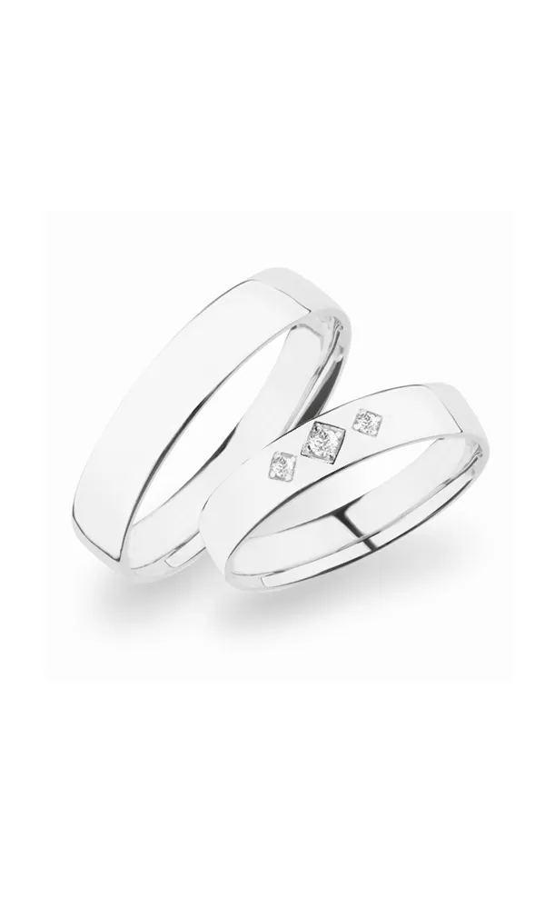 Snubní prsteny z rhodiovaného stříbra ryzosti 925/1000 mírně půlkulatém profilu s lesklou povrchovou úpravou. Snubní prsteny mají vnitřní Fit Profil - půlkulatou vnitřní stranu pro příjemnější nošení, nasazování a sundavání. V dámském prstenu jsou vsazeny do čtverečku tři kulaté zirkony popř. diamanty briliantového brusu. Snubní prsteny je možné vyrobit v různých šířkách a v různých povrchových úpravách.