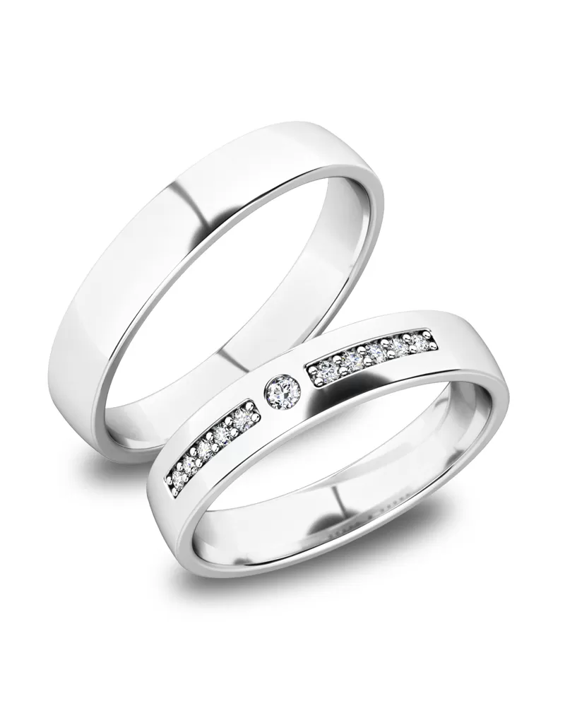 Snubní prsteny z rhodiovaného stříbra ryzosti 925/1000 mírně půlkulatého profilu s lesklou povrchovou úpravou. Snubní prsteny mají vnitřní Fit Profil - půlkulatou vnitřní stranu pro příjemnější nošení, nasazování a sundavání. V dámském prstenu je vsazen jeden větší a šest menších zirkonů popř. diamantů briliantového brusu. Snubní prsteny je možné vyrobit v různých šířkách a v různých povrchových úpravách. Snubní prsteny mají povrch zušlechtěn rhodiováním.