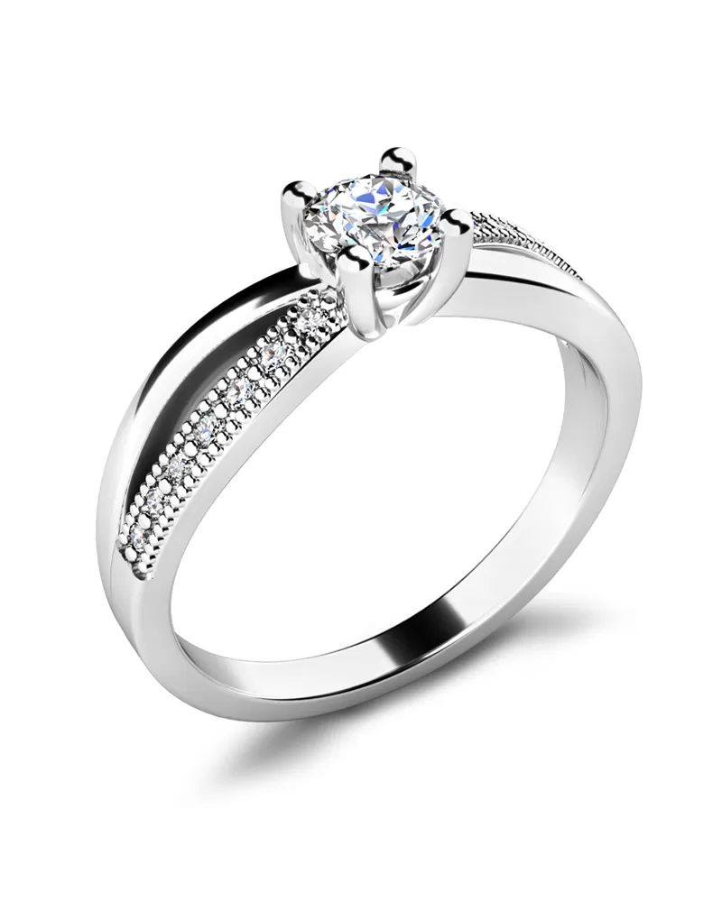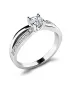 Elegantní prsten je vyroben z bílého čtrnáctikarátového zlata - 585/1000 v lesklé povrchové úpravě. Prstenu dominuje středový kulatý diamant, který je uchycený do čtyřkrapnové korunky. Toto uchycení nechá diamantu dokonale vyniknout v jeho kráse a brusu. Pro dokonalé zvýraznění prstenu je na každé straně v obroučce vsazeno sedm kulatých diamantů, které prsten zjemňují. Všechny diamanty mají briliantový brus, který zajišťuje maximální brilanci vybroušených facet, dokonale odráží světlo a diamanty krásně září z každého úhlu pohledu! Díky skladbě a stylově čistému vsazení diamantů, prsten vyniká krásnou brilancí kamenů. Vsazování diamantů do prstenů provádějí naši nejzkušenější mistři zlatníci ručně pod mikroskopem s přesností na 0,01mm a proto nehrozí vypadnutí kamínků jako to bývá u strojně vyráběných prstenů.