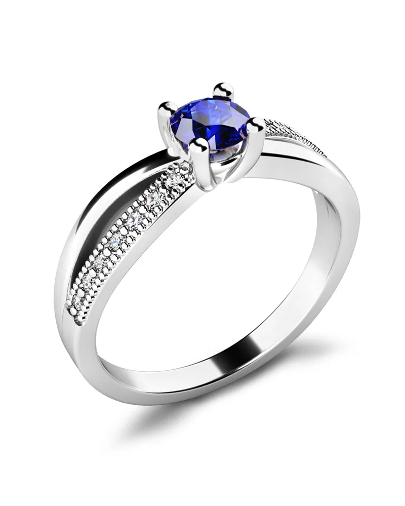 Elegantní prsten je vyroben z bílého čtrnáctikarátového zlata - 585/1000 v lesklé povrchové úpravě. Prstenu dominuje středový kulatý modrý safír, který je uchycený do čtyřkrapnové korunky. Toto uchycení nechá safíru dokonale vyniknout v jeho kráse a brusu. Pro dokonalé zvýraznění prstenu je na každé straně v obroučce vsazeno sedm kulatých diamantů, které prsten zjemňují. Všechny diamanty mají briliantový brus, který zajišťuje maximální brilanci vybroušených facet, dokonale odráží světlo a diamanty krásně září z každého úhlu pohledu! Díky skladbě a stylově čistému vsazení kamenů, vyniká prsten krásnou brilancí všech kamenů. Vsazování diamantů do prstenů provádějí naši nejzkušenější mistři zlatníci ručně pod mikroskopem s přesností na 0,01mm a proto nehrozí vypadnutí kamínků jako to bývá u strojně vyráběných prstenů.