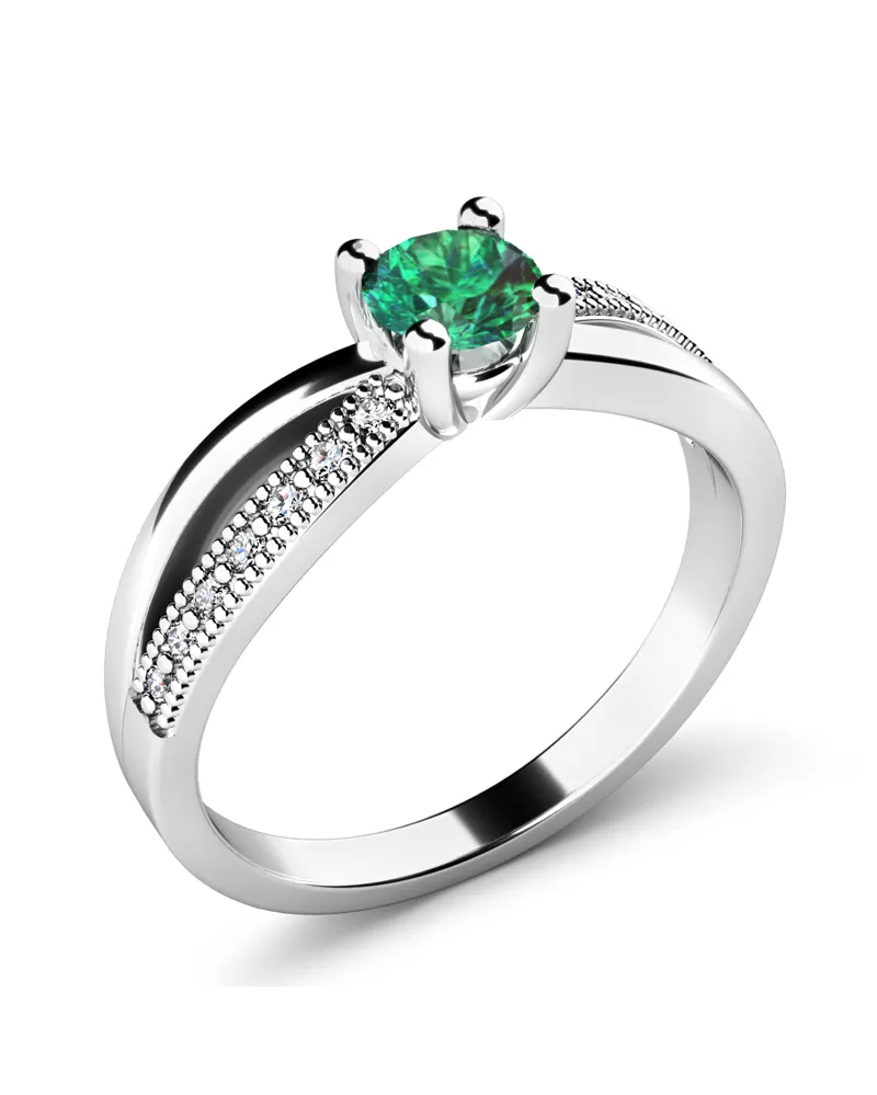 Elegantní prsten je vyroben z bílého čtrnáctikarátového zlata - 585/1000 v lesklé povrchové úpravě. Prstenu dominuje středový kulatý smaragd, který je uchycený do čtyřkrapnové korunky. Toto uchycení nechá smaragdu dokonale vyniknout v jeho kráse a brusu. Pro dokonalé zvýraznění prstenu je na každé straně v obroučce vsazeno sedm kulatých diamantů, které prsten zjemňují. Všechny diamanty mají briliantový brus, který zajišťuje maximální brilanci vybroušených facet, dokonale odráží světlo a diamanty krásně září z každého úhlu pohledu! Díky skladbě a stylově čistému vsazení kamenů, vyniká prsten krásnou brilancí všech kamenů. Vsazování diamantů do prstenů provádějí naši nejzkušenější mistři zlatníci ručně pod mikroskopem s přesností na 0,01mm a proto nehrozí vypadnutí kamínků jako to bývá u strojně vyráběných prstenů.