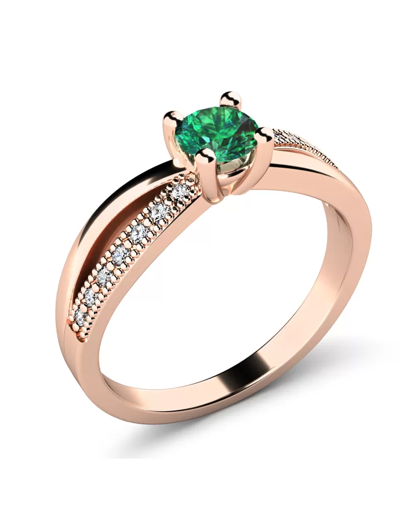 Elegantní prsten je vyroben z růžového čtrnáctikarátového zlata - 585/1000 v lesklé povrchové úpravě. Prstenu dominuje středový kulatý smaragd, který je uchycený do čtyřkrapnové korunky. Toto uchycení nechá smaragdu dokonale vyniknout v jeho kráse a brusu. Pro dokonalé zvýraznění prstenu je na každé straně v obroučce vsazeno sedm kulatých diamantů, které prsten zjemňují. Všechny diamanty mají briliantový brus, který zajišťuje maximální brilanci vybroušených facet, dokonale odráží světlo a diamanty krásně září z každého úhlu pohledu! Díky skladbě a stylově čistému vsazení kamenů, vyniká prsten krásnou brilancí všech kamenů. Vsazování diamantů do prstenů provádějí naši nejzkušenější mistři zlatníci ručně pod mikroskopem s přesností na 0,01mm a proto nehrozí vypadnutí kamínků jako to bývá u strojně vyráběných prstenů.