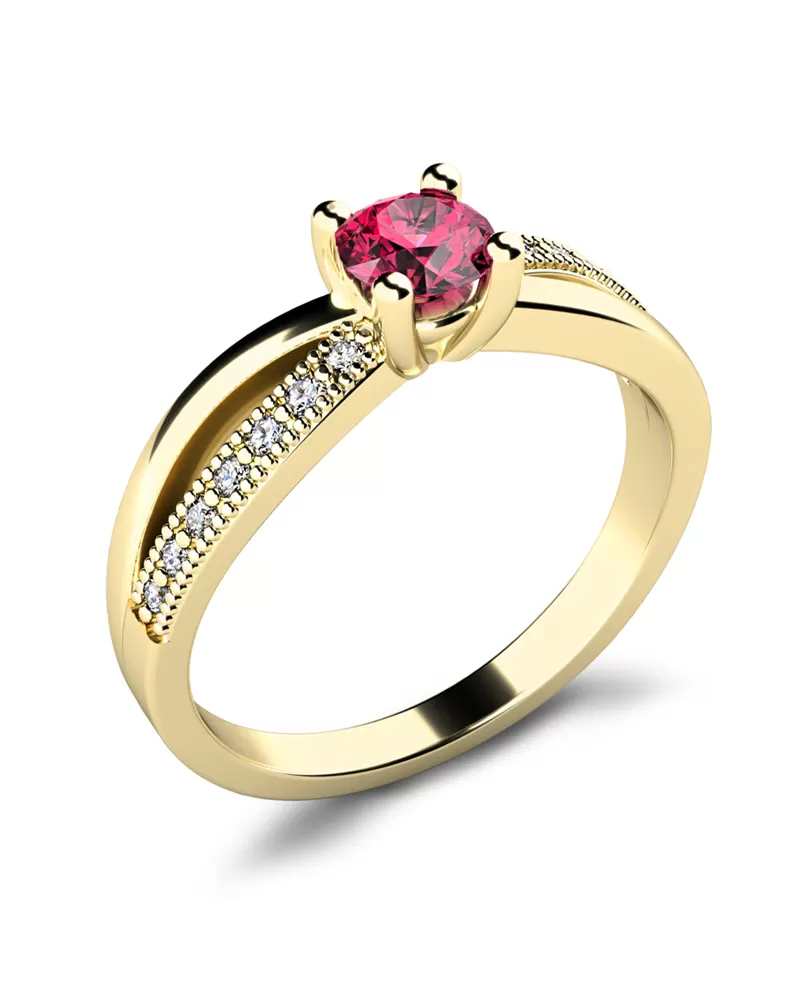 Elegantní prsten je vyroben ze žlutého čtrnáctikarátového zlata - 585/1000 v lesklé povrchové úpravě. Prstenu dominuje středový kulatý turmalín, který je uchycený do čtyřkrapnové korunky. Toto uchycení nechá turmalínu dokonale vyniknout v jeho kráse a brusu. Pro dokonalé zvýraznění prstenu je na každé straně v obroučce vsazeno sedm kulatých diamantů, které prsten zjemňují. Všechny diamanty mají briliantový brus, který zajišťuje maximální brilanci vybroušených facet, dokonale odráží světlo a diamanty krásně září z každého úhlu pohledu! Díky skladbě a stylově čistému vsazení kamenů, vyniká prsten krásnou brilancí všech kamenů. Vsazování diamantů do prstenů provádějí naši nejzkušenější mistři zlatníci ručně pod mikroskopem s přesností na 0,01mm a proto nehrozí vypadnutí kamínků jako to bývá u strojně vyráběných prstenů.