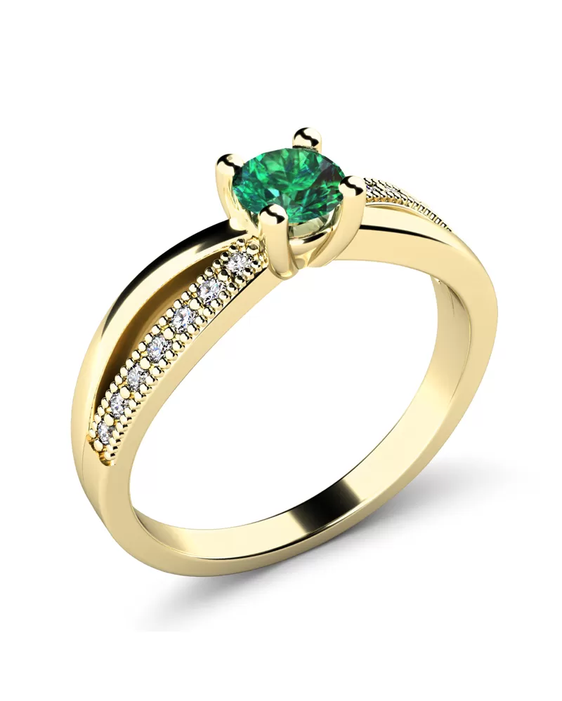 Elegantní prsten je vyroben ze žlutého čtrnáctikarátového zlata - 585/1000 v lesklé povrchové úpravě. Prstenu dominuje středový kulatý smaragd, který je uchycený do čtyřkrapnové korunky. Toto uchycení nechá smaragdu dokonale vyniknout v jeho kráse a brusu. Pro dokonalé zvýraznění prstenu je na každé straně v obroučce vsazeno sedm kulatých diamantů, které prsten zjemňují. Všechny diamanty mají briliantový brus, který zajišťuje maximální brilanci vybroušených facet, dokonale odráží světlo a diamanty krásně září z každého úhlu pohledu! Díky skladbě a stylově čistému vsazení kamenů, vyniká prsten krásnou brilancí všech kamenů. Vsazování diamantů do prstenů provádějí naši nejzkušenější mistři zlatníci ručně pod mikroskopem s přesností na 0,01mm a proto nehrozí vypadnutí kamínků jako to bývá u strojně vyráběných prstenů.