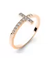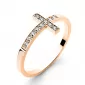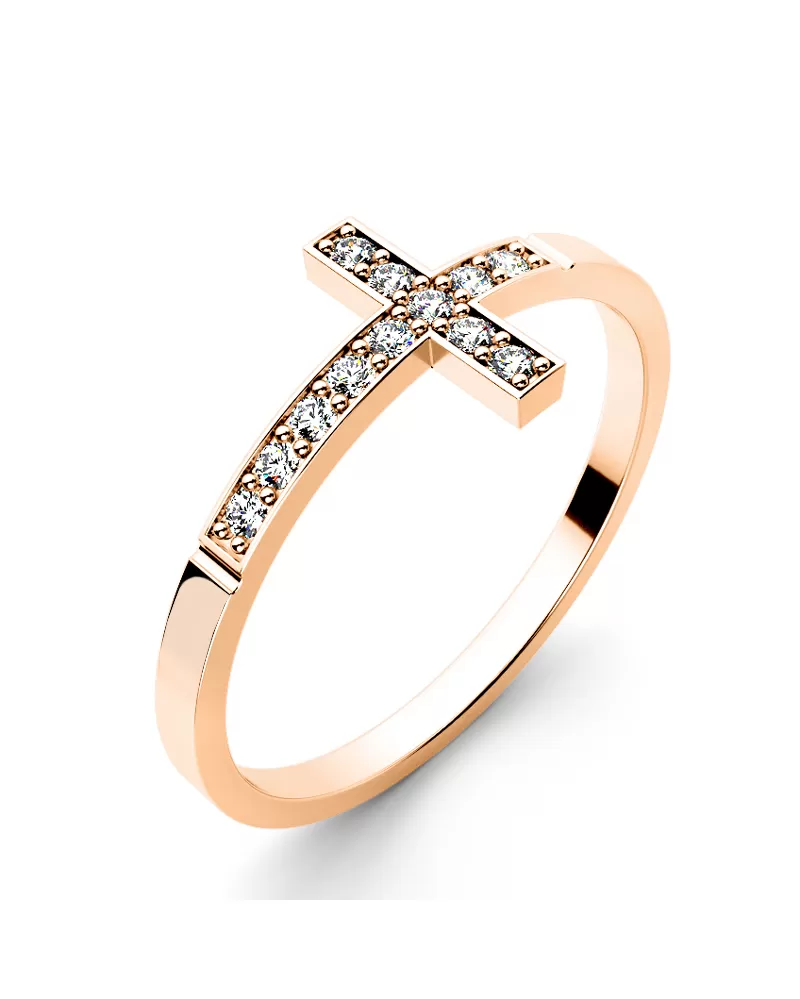 Designový prsten ve tvaru kříže, je vyroben z růžového čtrnácti karátového zlata - 585/1000 v lesklé povrchové úpravě. Do tvaru kříže je vsazeno dvanáct diamantů vybroušených kulatým briliantovým brusem, který zajišťuje maximální brilanci vybroušených facet, dokonale odráží světlo a neuvěřitelné září z každého úhlu pohledu! Vsazování diamantů provádějí naši nejzkušenější mistři zlatníci ručně pod mikroskopem s přesností na 0,01mm a proto nehrozí vypadnutí kamínků jako to bývá u strojně vyráběných prstenů.