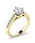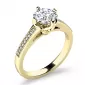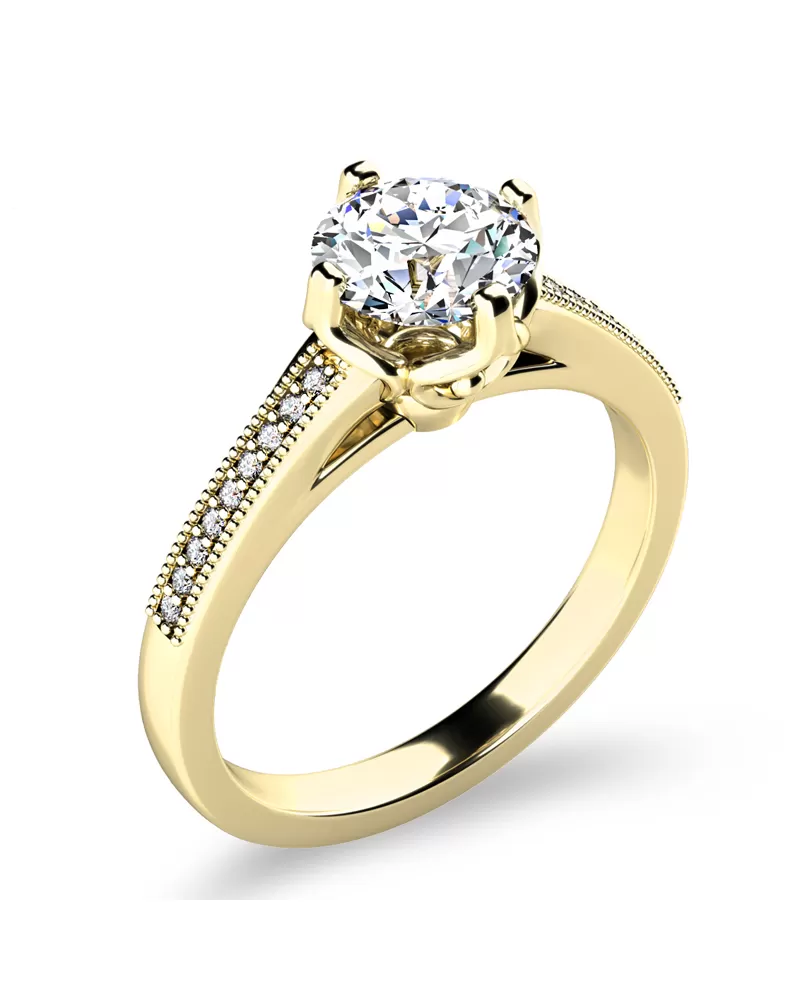 Luxusní dámský prsten typu je vyroben ze žlutého čtrnáctikarátového zlata - 585/1000 v lesklé povrchové úpravě. Do prstenu je vsazen jeden výrazný kulatý diamant do čtyřkrapnové korunky, který dokonale zvýrazňuje celý prsten a poté je vedle něj vsazeno 18 menších kulatých diamantů. Diamanty jsou vybroušené briliantovým brusem Signity star, který zajišťuje maximální brilanci kamenů. Vsazování diamantů do prstenů provádějí naši nejzkušenější mistři zlatníci ručně pod mikroskopem s přesností na 0,01mm a proto nehrozí vypadnutí kamínků jako to bývá u strojně vyráběných prstenů.
