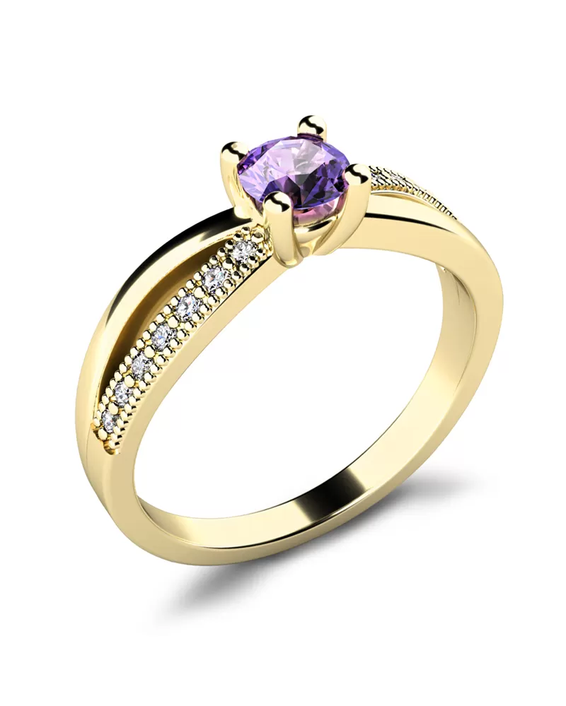 Elegantní prsten je vyroben ze žlutého čtrnáctikarátového zlata - 585/1000 v lesklé povrchové úpravě. Prstenu dominuje středový kulatý Tanzanit, který je uchycený do čtyřkrapnové korunky. Toto uchycení nechá Tanzanitu dokonale vyniknout v jeho kráse a brusu. Pro dokonalé zvýraznění prstenu je na každé straně v obroučce vsazeno sedm kulatých diamantů, které prsten zjemňují. Všechny diamanty mají briliantový brus, který zajišťuje maximální brilanci vybroušených facet, dokonale odráží světlo a diamanty krásně září z každého úhlu pohledu! Díky skladbě a stylově čistému vsazení kamenů, vyniká prsten krásnou brilancí všech kamenů. Vsazování diamantů do prstenů provádějí naši nejzkušenější mistři zlatníci ručně pod mikroskopem s přesností na 0,01mm a proto nehrozí vypadnutí kamínků jako to bývá u strojně vyráběných prstenů.