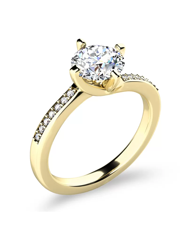 Zásnubní prsten je vyroben ze žlutého čtrnáctikarátového zlata - 585/1000 v lesklé povrchové úpravě. Prsten má jeden hlavní dominantní diamant kulatého briliantového brusu, který je uchycený do čtyřkrapnové korunky. Toto uchycení nechá diamant dokonale vyniknout v jeho kráse a brusu. Po stranách v obroučce prstenu je vsazeno na každé straně 7 zářivých diamantů, které prsten zjemňují. Všechny diamanty mají briliantový brus, který zajišťuje maximální brilanci vybroušených facet, dokonale odráží světlo a neuvěřitelné září z každého úhlu pohledu! Díky skladbě a stylově čistému vsazení diamantů, vyniká prsten krásnou brilancí kamenů. Vsazování diamantů do zásnubních prstenů provádějí naši nejzkušenější mistři zlatníci ručně pod mikroskopem s přesností na 0,01mm a proto nehrozí vypadnutí kamínků jako to bývá u strojně vyráběných zásnubních prstenů.