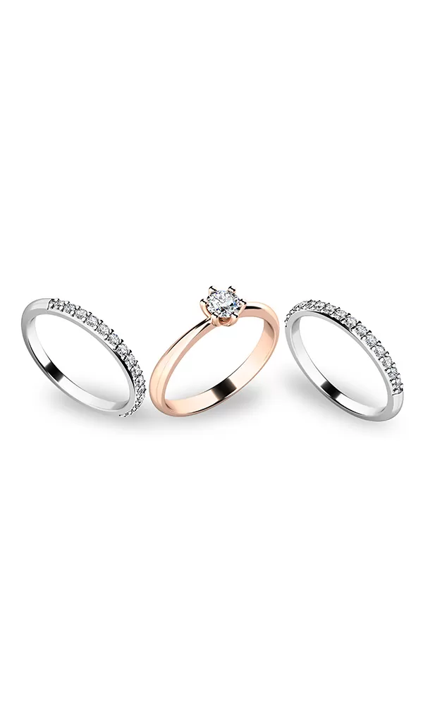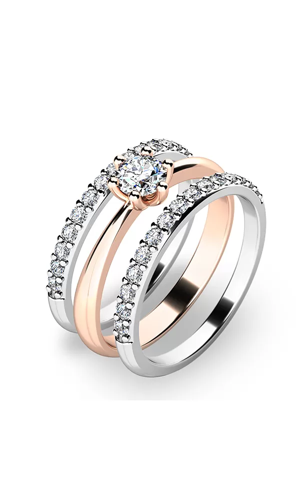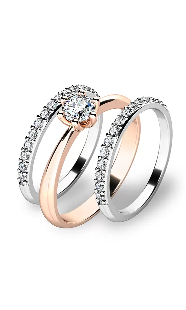 Krásný set prstenů 10819 a dvou 10845 vás okouzlí na první pohled. Prsteny jsou vyrobené ze čtrnácti karátového růžového a bílého zlata o ryzosti 585/1000 s lesklým povrchem. Hlavní prsten má jeden zirkon kulatého brusu, který je uchycený do šestikrapnové korunky. Prsten je čistého designu v klasickém provedení, který patří stále k nejoblíbenějším typům zásnubních prstenů. Dva kroužky jsou osazeny patnácti kusy menších zirkonů v jedné linii. Tento set si rozhodně zamiluje každá žena, které ho darujete.
