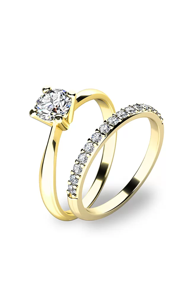 Zajímavý set prstenů 10770 a 10845 vás okouzlí na první pohled. Prsteny jsou vyrobené ze čtrnácti karátového žlutého zlata o ryzosti 585/1000 s lesklým povrchem. Hlavní prsten je osázen velkým zirkonem v briliantovém brusu a kroužek patnácti kusy menších zirkonů v jedné linii. Prsteny působí velmi jemně a elegantně. Každá žena se do tohoto setu zamiluje a zaujme s ním okolí.